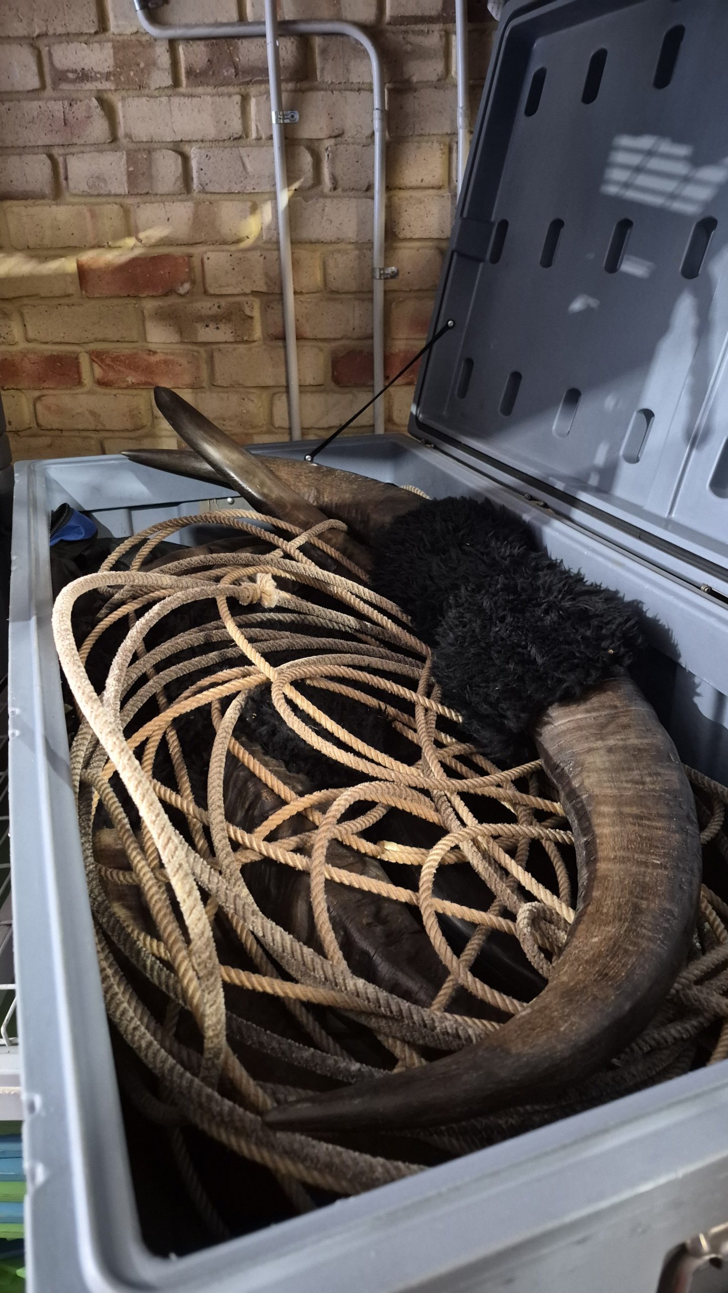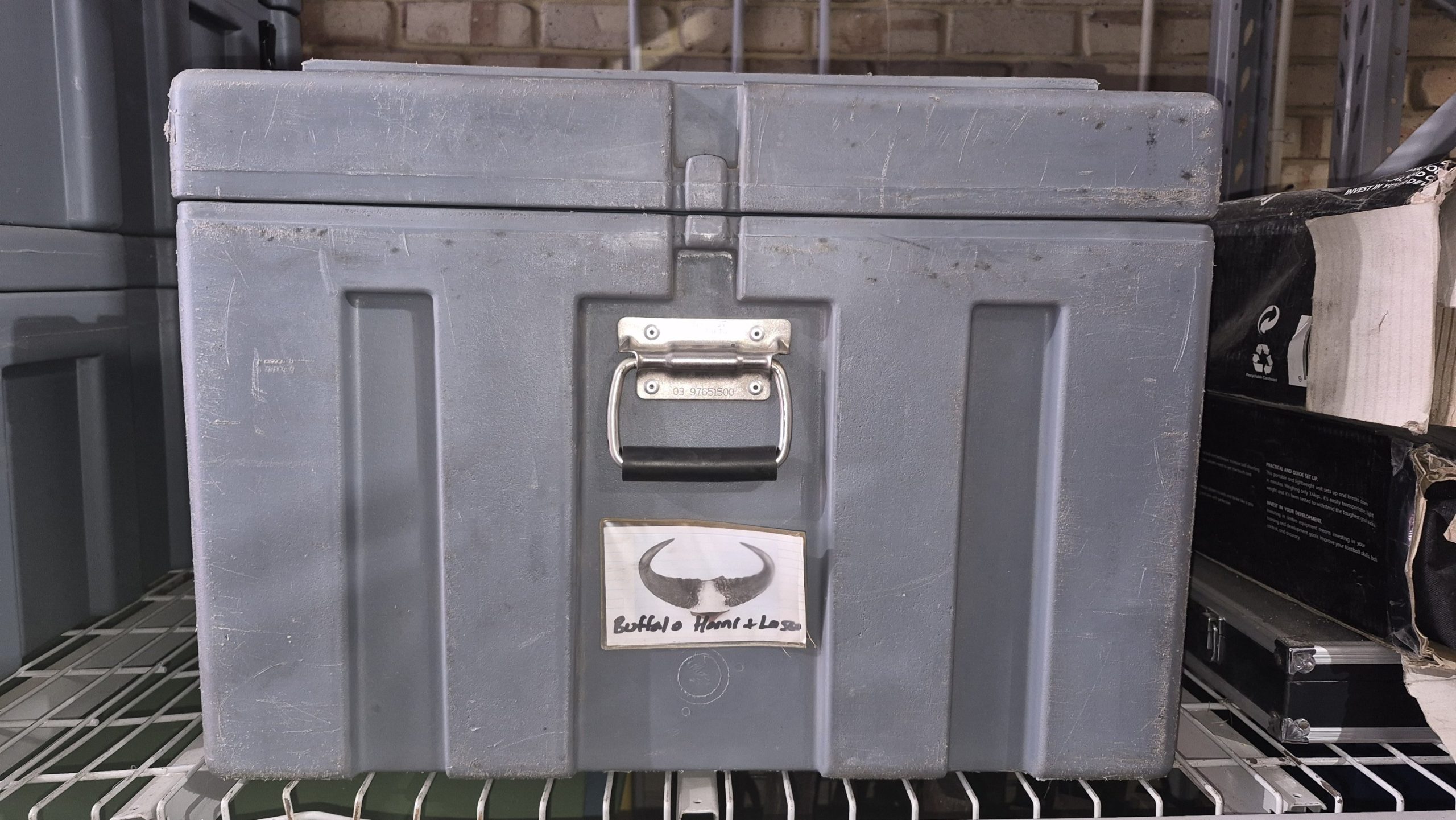 ONE LARGE GREY CRATE, the buffalo toss is stored in two places, closeby to each other